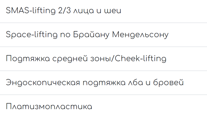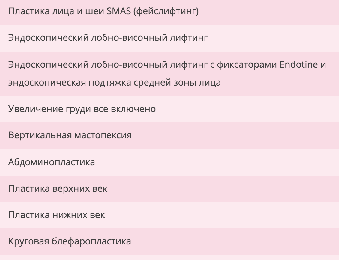 С главной страницы с верхнего меню человек попадает в каталог операций. Там организован поиск статей по названию процедур в алфавитном порядке. Этот пункт подходит для тех, кто точно знает, как называется операция.