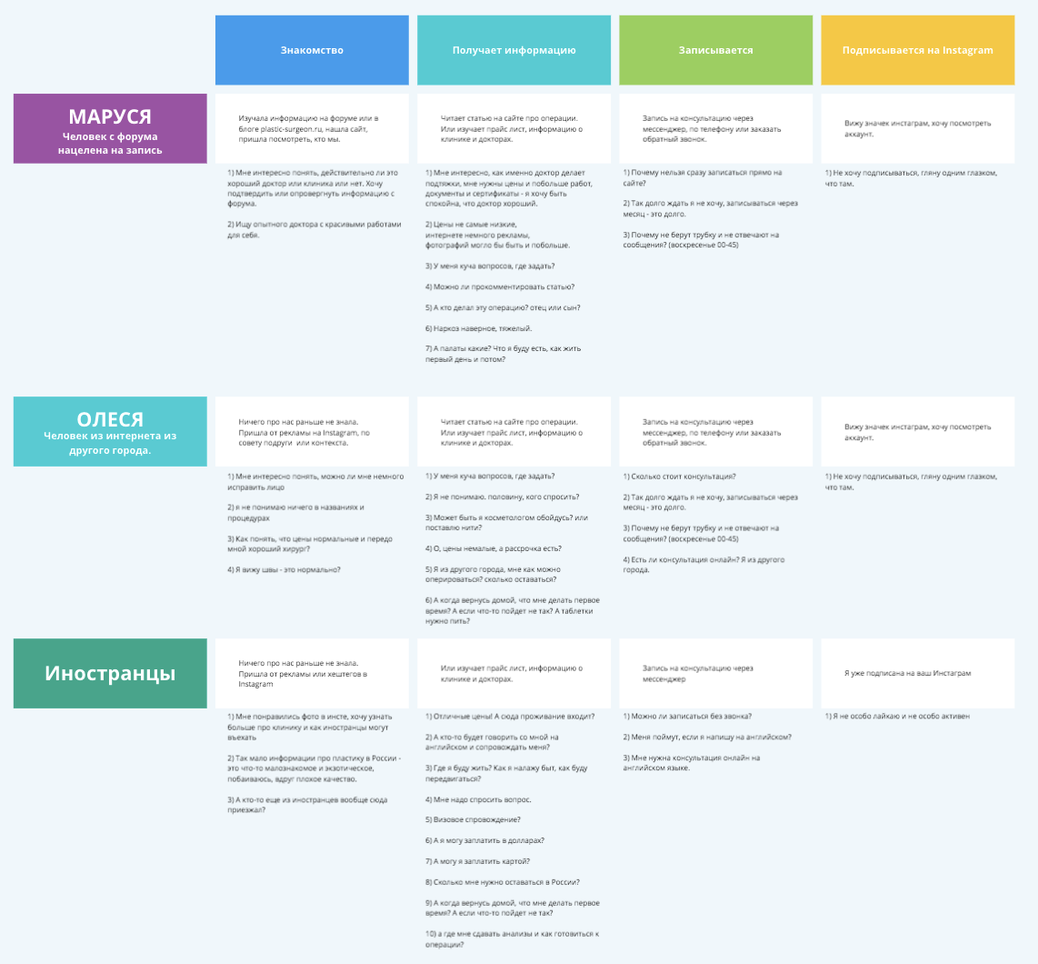 Я выбрала основных пользователей и сделала CJM. Сайт больше выполняет информативную функцию и на нем можно записаться, это не то же самое, что приложение или большой сервисный сайт, поэтому CJM получилась на очень большой.