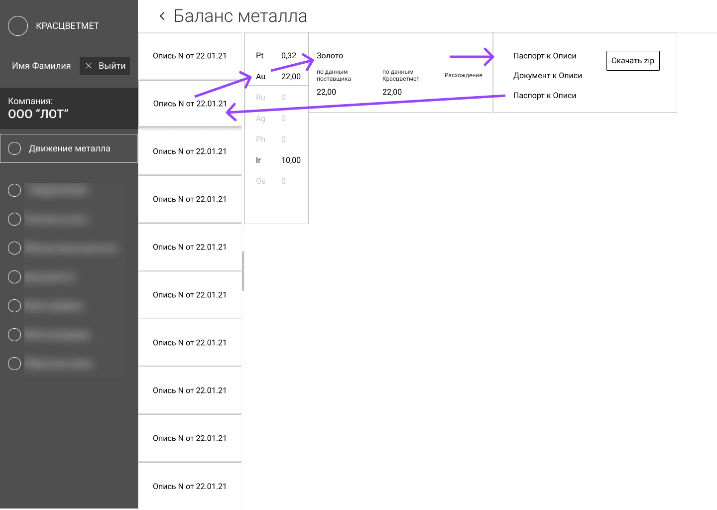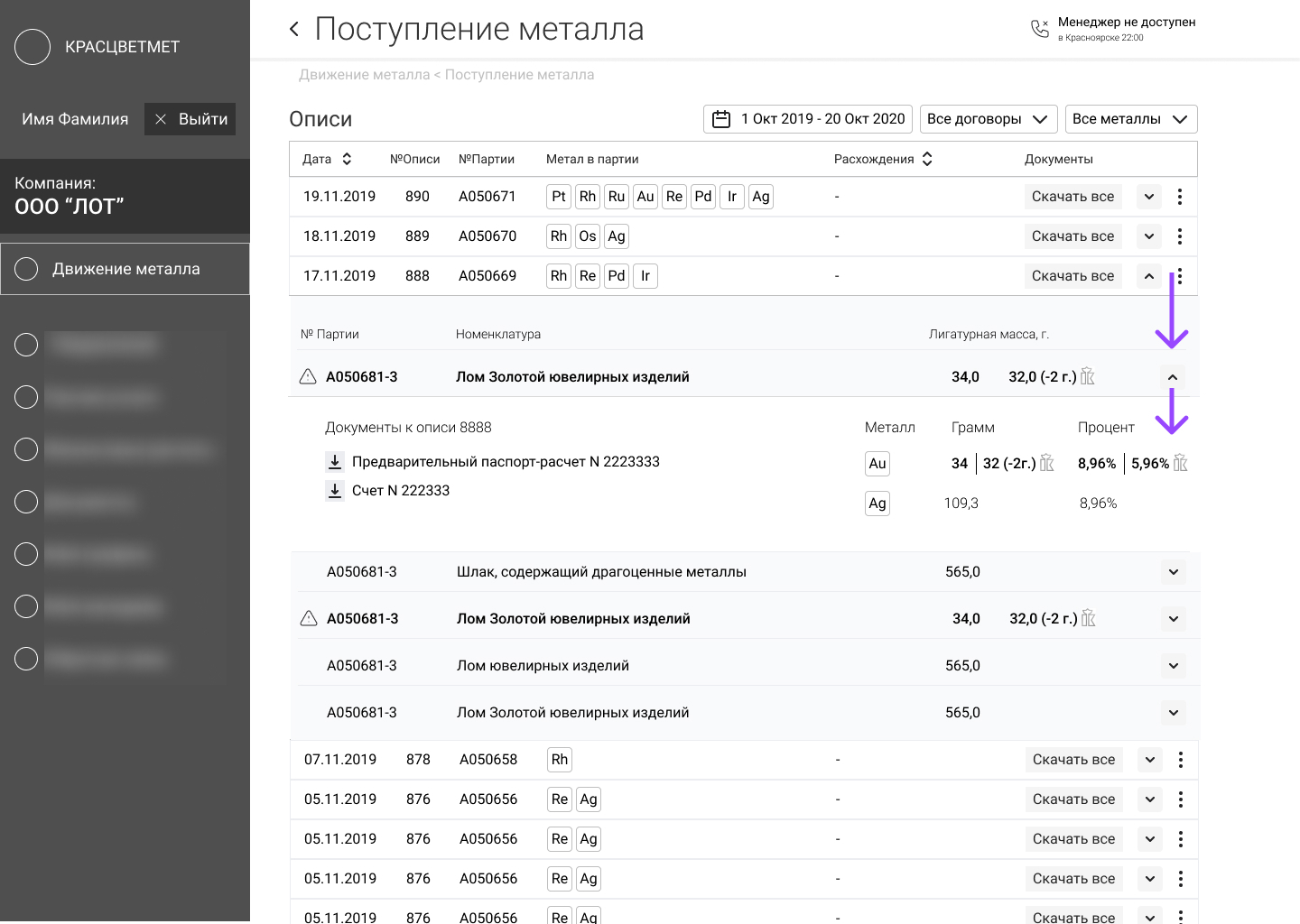 ❌Просмотр документов партии был организован раскрытием слева направо, сверху вниз, причем в последней колонке была информация, которая относится ко всей партии, а не к каждому отдельному металлу.