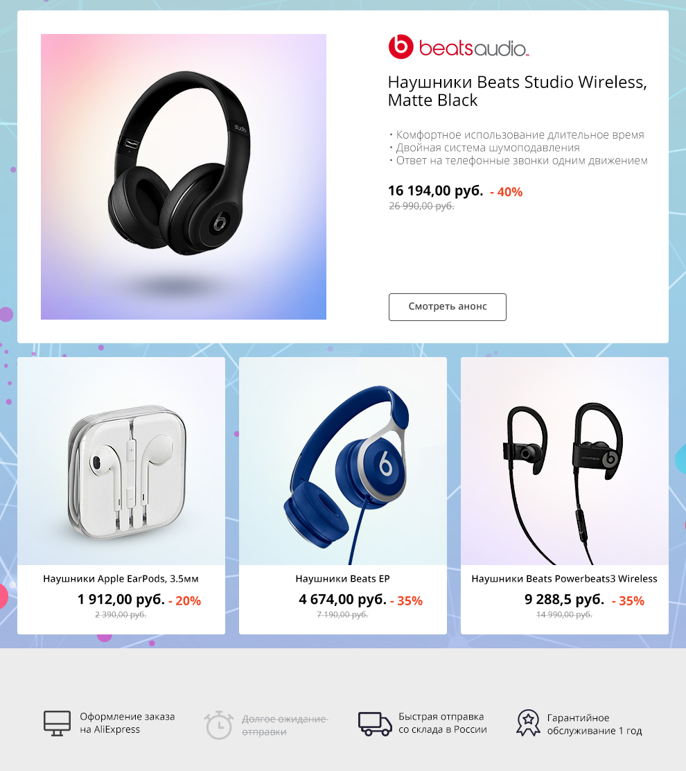 китайский интернет-магазин, который делает контент на русском языке. Я делала промо-страницы такие, как эта и продуктовые лендинги для товаров.